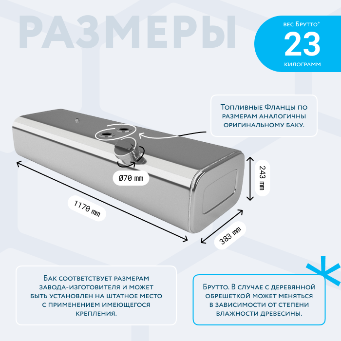 - Так же, если вы приобретаете алюминиевый топливный бак, он будет в деревянной обрешетке (для усиления защиты при транспортировке). При просчете веса и объема, цена за доставку может измениться по факту взвешивания на самом терминале транспортной компании. Так как деревянная обрешетка соответственно изготовлена из древесины, и она имеет свойство значительно набирать вес в зависимости от влажности окружающей среды.