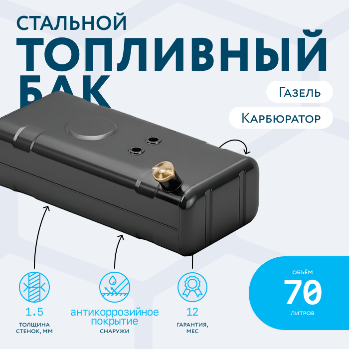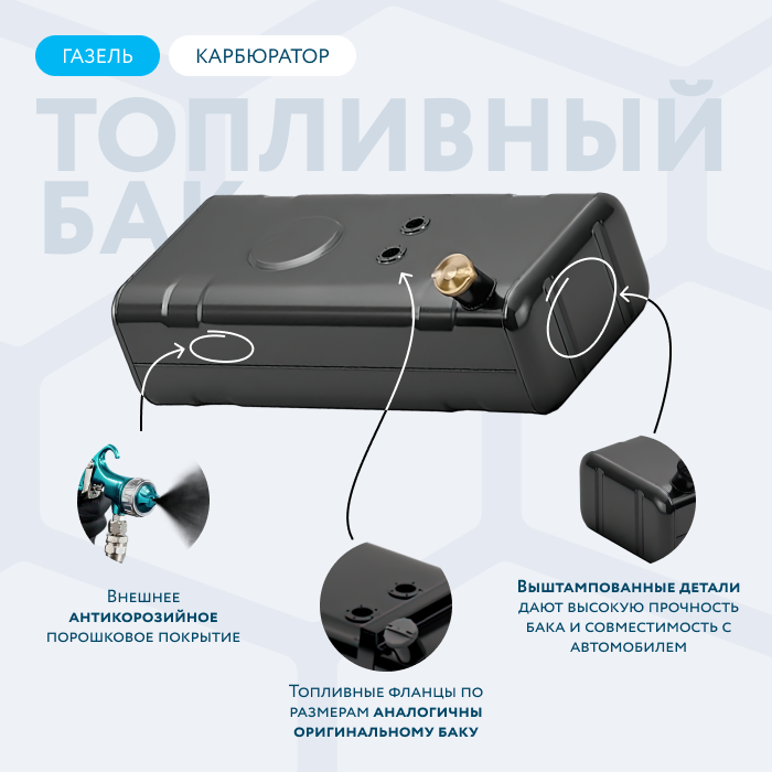 Топливный бак (аналог 33023-1101010) для а/м ГАЗ-3302 с карбюраторным двигателем, с любой колёсной базой, предназначенный для замены оригинального стального бака.