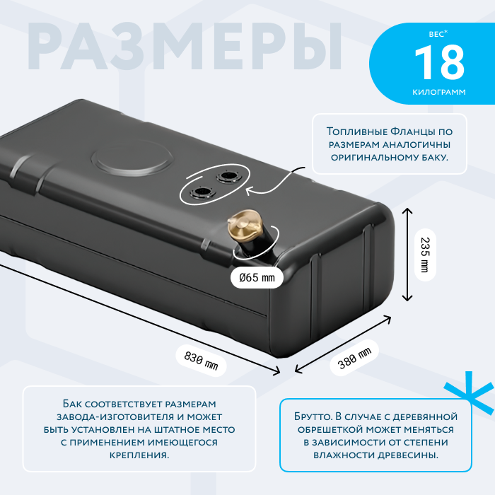 Технологические отверстия на баке соответствуют заводскому по размерам и расположению - с родного бака можно переставить топливозаборник и датчик уровня топлива. Горловина соответствует родной по вылету, наклону, диаметру и расположению. Бак можно установить на родные крепления без доработок.