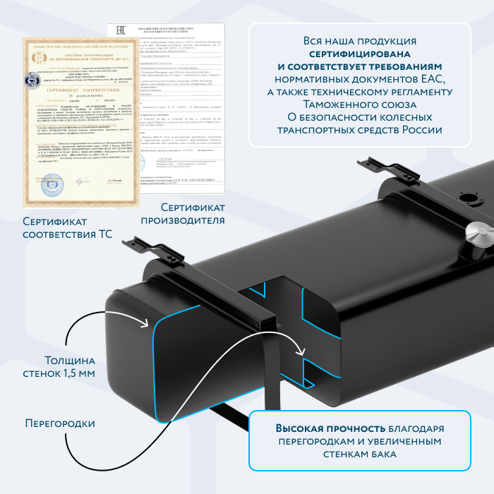Топливный бак производства БАКОР (аналог 6430-1101010) предназначен для установки на а/м МАЗ (модификаций 544069, 5440, 643068, 6430A8 (5440A8, 5440A5) с ПРАВОЙ стороны.