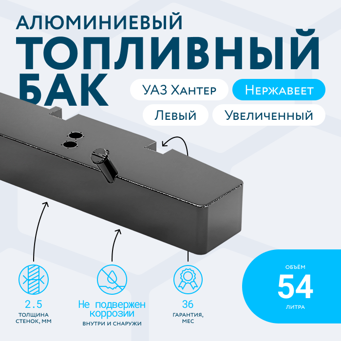 В стоимость левого топливного бака УАЗ Хантер уже включены: масло-бензостойкие резиновые прокладки хомута (2 шт.), хомуты топливного бака (2 шт.) В комплекте с баком поставляются нержавеющие болты для крепления датчика и топливозаборника, имеют по 5 болтов, M5х14 (10 шт.), РТИ для герметизации фланца датчика /топливозаборника (2 шт.), что позволяет выполнить установку бака под ключ.